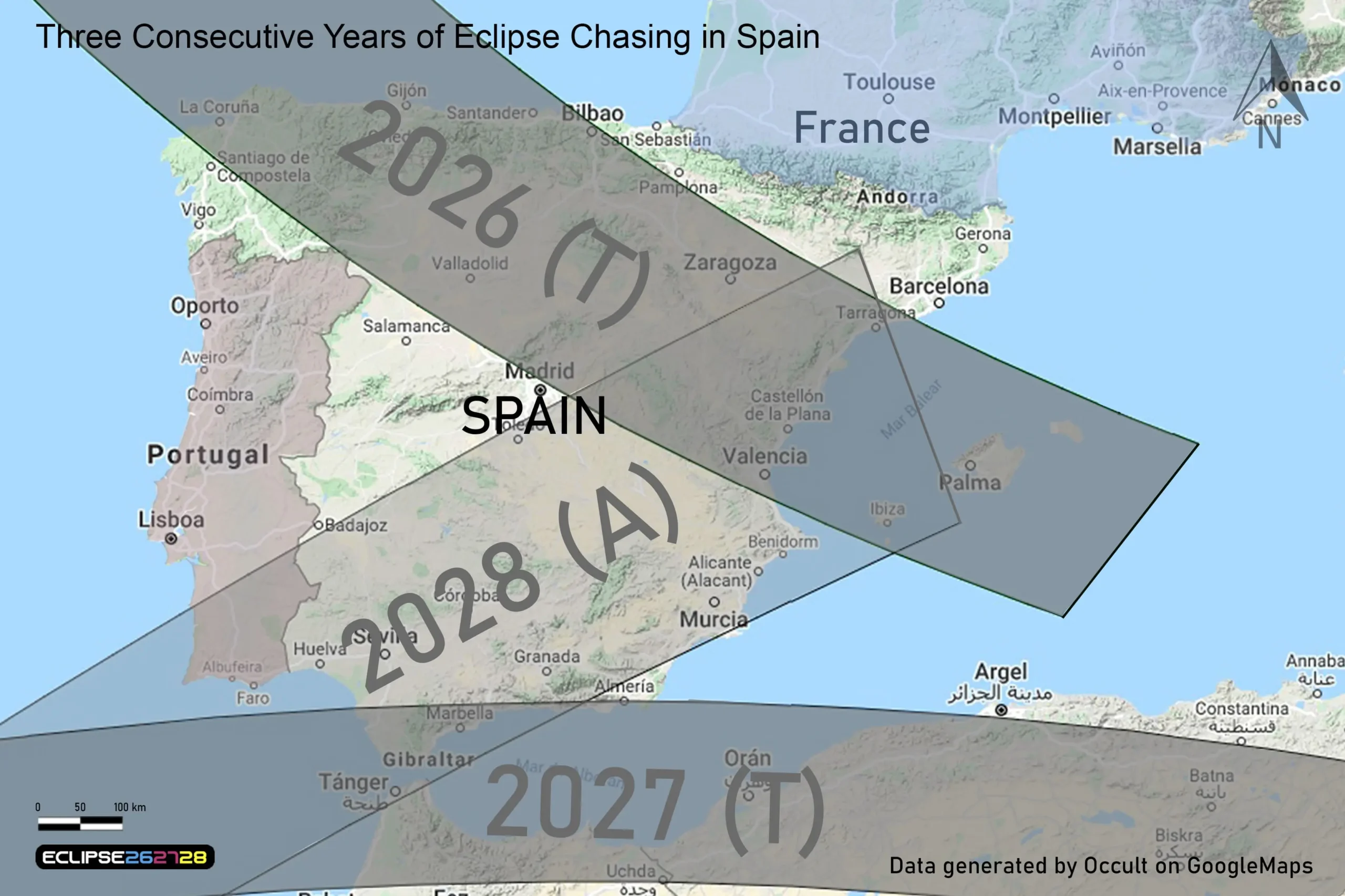 In 2026, 2027 and 2028, the paths of three solar eclipses will cross over Spain. The eclipses of 2026 and 2027 will be total and that of 2028 will be annular. Those are the first total solar eclipses to occur over mainland Europe in the 21st century and the Iberian Peninsula will be experiencing its first total solar eclipse after more than a century. Undoubtedly, Spain will become the epicenter of one of the most fascinating natural phenomena and will be the top destination in the whole world to observe the total solar eclipse of 2026 according to the path of totality.