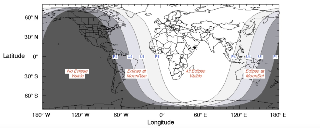 Franja de visibilidad del eclipse lunar parcial del 28 de octubre de 2023, creado por Fred Espenak. Crédito: F. Espenak, GSFC de la NASA, eclipse.gsfc.nasa.gov