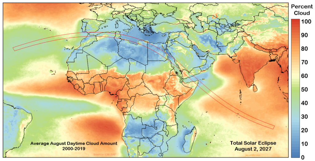 La sombra lunar de 2027 saluda por primera vez a la Tierra sobre el Atlántico medio subtropical, en una región de cielos moderadamente nublados, muy al norte de la zona de reproducción de huracanes, frente a África occidental. El sendero de sombra umbral pasa por alto las islas de Porto Santo y Madeira por apenas 70 kilómetros en su recorrido hacia el este, y en su lugar elige tocar tierra en España y Marruecos seis minutos después. Durante los siguientes 4.000 kilómetros, salta a lo largo de la costa mediterránea girando gradualmente hacia el sureste. El giro hacia latitudes más meridionales se produce con cantidades cada vez mayores de nubes, pero, excepto en las montañas de Arabia, la mayor parte de ellas se entrometen después de que el camino cruza el Océano Índico, hacia su final cerca del remoto atolón de Diego García. Pocos eclipses ofrecen una garantía de cielos sin nubes, pero, en algunas partes, la trayectoria del total de 2027 en el norte de África se acerca mucho (Figura 1). Gran parte del recorrido del eclipse bordea el lado norte del desierto del Sahara y la climatología de agosto a lo largo del camino de sombra, toma prestado su carácter de ese gran mar de arena. Hace calor, está seco, hace sol y hay polvo.