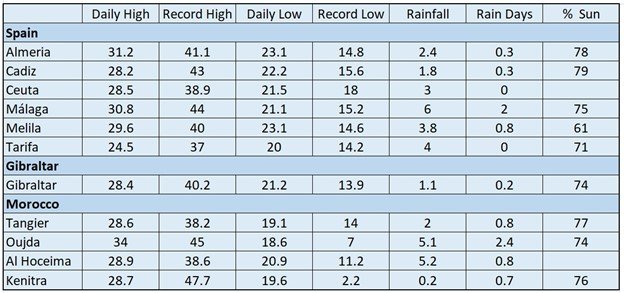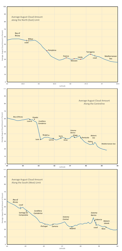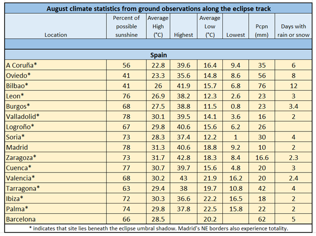 El clima estival de España, y una parte muy pequeña de Portugal, es dominado por el sol, con un porcentaje de sol posible en agosto (el porcentaje de horas soleadas entre el amanecer y el atardecer) que generalmente se encuentra en el rango del 70 por ciento a lo largo de la mayor parte de la trayectoria del eclipse (Tabla 2). No es una nubosidad uniformemente distribuida, ya que ciertas partes del país son más propensas a la formación de nubes que otras. Los viajeros del eclipse encontrarán un considerable valor en prestar atención a las particularidades de la climatología y topografía de España en conjunto.