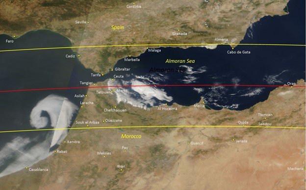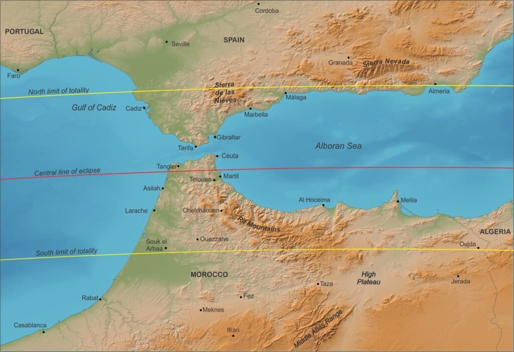 Este eclipse total es el primero de dos en esta pequeña parte del mundo, le seguirá un eclipse anular en solo cinco meses, en enero de 2028. Para este evento de 2027, la sombra umbral pasa principalmente sobre el Mar de Alborán (Figura 2), pero en el camino toca la costa de Andalucía, las ciudades autónomas españolas de Ceuta y Melilla. en el norte de África, el norte de Marruecos y el territorio británico de Gibraltar.