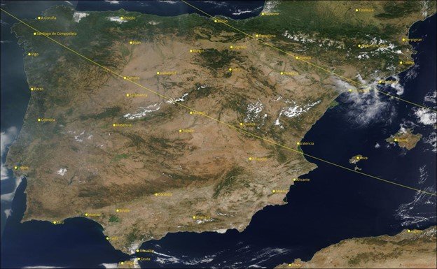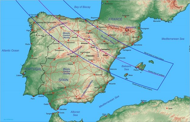La Península Ibérica tiene una topografía accidentada que está definida a lo largo de la trayectoria del eclipse por tres cordilleras montañosas, dos mesetas centrales elevadas, un valle fluvial y dos llanuras costeras (Figura 5). Al norte, la Cordillera Cantábrica bloquea la humedad procedente de la Bahía de Vizcaya, reteniéndola contra las tierras bajas costeras y evitando su intrusión en la parte central de la península. Hay brechas en la barrera, principalmente en el lado norte de la línea central, entre Bilbao y Burgos, pero incluso allí, la invasión de humedad generalmente se ve ralentizada por las alturas de 1000 metros al noreste de Burgos.