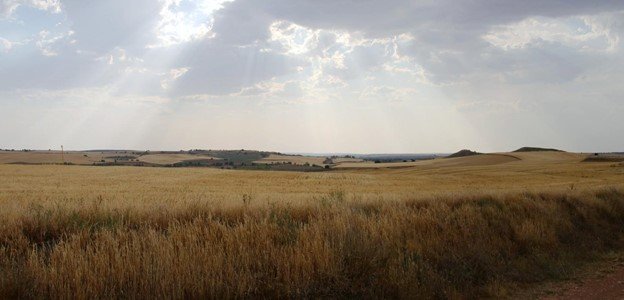 En el centro de España, la trayectoria del eclipse se adentra en un paisaje mucho más complicado. Al norte de la línea central, la sombra cae principalmente en las tierras bajas de la Cuenca del Ebro. Al sur, cruza la Meseta Central (Figura 7), una meseta elevada de 600 a 700 metros que está dividida en una parte norte y una parte sur por la Sierra de Guadarrama, una cadena montañosa al norte de Madrid. La Sierra se encuentra generalmente a unos 1000 metros más alta que la Meseta, pero alcanza los 2400 metros sobre el nivel del mar en su punto más alto. El Sistema Ibérico comienza al sureste de Burgos y se curva hacia el sur, primero en el lado norte de la línea central, pero luego se extiende por casi todo el lado sur de la trayectoria a medida que se acerca a la costa mediterránea. Es una colección caprichosa de al menos siete cadenas y masas montañosas más pequeñas, separando la Meseta de la Cuenca del Ebro en el norte y de la costa mediterránea en el este. Las cumbres en el Ibérico son modestas, alcanzando alrededor de 2300 metros.