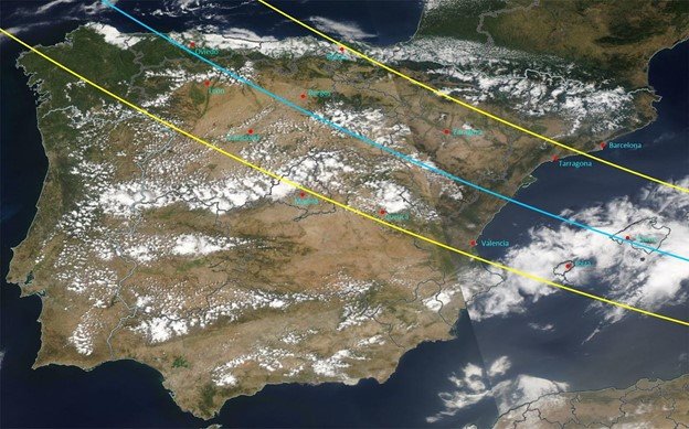 Toda esta topografía montañosa tiene un impacto en la climatología de nubes de la Península Ibérica. En la Figura 8, vemos los contornos generales del terreno reflejados en los patrones de nubes (comparar con la Figura 5). Los tonos amarillos de nubes altas se encuentran principalmente sobre el terreno elevado, mientras que los tonos azules se extienden por las bajas altitudes de las cuencas de la Meseta y el Valle del Ebro. Las diferencias en la cantidad de nubes son relativamente pequeñas una vez que la trayectoria ha cruzado la Cordillera Cantábrica, especialmente a lo largo de la línea central, que se desplaza entre regiones de buen y mal tiempo, pero siempre se mantiene alrededor del 35 por ciento. Las cadenas montañosas obligan al aire a ascender, lo que lo enfría y condensa en nubes. En España, las montañas están cubiertas de bosques oscuros que absorben la luz solar, se calientan rápidamente bajo el sol del verano y dan lugar a nubes convectivas siempre que la atmósfera sea lo suficientemente inestable. La ubicación de estos bosques de bajo albedo se puede ver en la Figura 9, que también muestra nubes convectivas comenzando a desarrollarse sobre algunas de las regiones más oscuras.