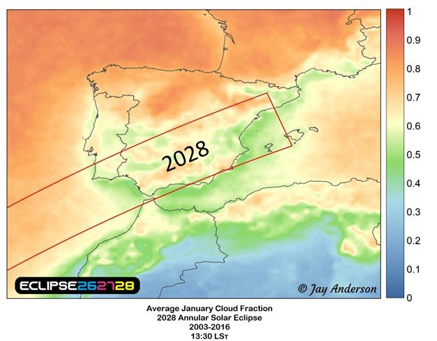 Obtener un cielo despejado para el día del eclipse es una de las preocupaciones más importantes y serias para los observadores del eclipse. Eclipse262728, agradece amablemente al Dr. Jay Anderson, quien proporciona estadísticas meteorológicas y predicciones para los eclipses solares del futuro cercano. Anderson ayuda a los cazadores de eclipses con patrones climáticos y mapas de cobertura de nubes a largo plazo y lo largo de la franja de totalidad.Cada uno de los siguientes mapas muestra la probabilidad de cielos despejados para una región en una fecha específica, según los mapas anuales recientes de nubosidad. Como se ilustra en el mapa, es más probable que las áreas de color azul tengan cielos despejados, pero es más probable que las áreas de color rojo estén nubladas durante el día del eclipse. El eclipse solar anular de 2028 se producirá justo antes del atardecer en España. Los mapas de nubosidad muestran que enero es mucho más nublado que los dos eclipses de agosto. Jay Anderson explica que existe una clara distinción entre el norte y el sur de España, ya que el norte tiene una climatología más atlántica, mientras que el sur está influenciado por el Mediterráneo. Curiosamente, en las regiones centrales y sur, las montañas tienden a ser más soleadas que las tierras bajas, por lo que una mejor climatología de nubes de Andalucía se encuentra en Sierra Nevada en Granada y Almería y Sierra Morena en Sevilla. El área alrededor de Valencia e Ibiza también es prometedora, aunque el sol está muy bajo para el eclipse de 2028.