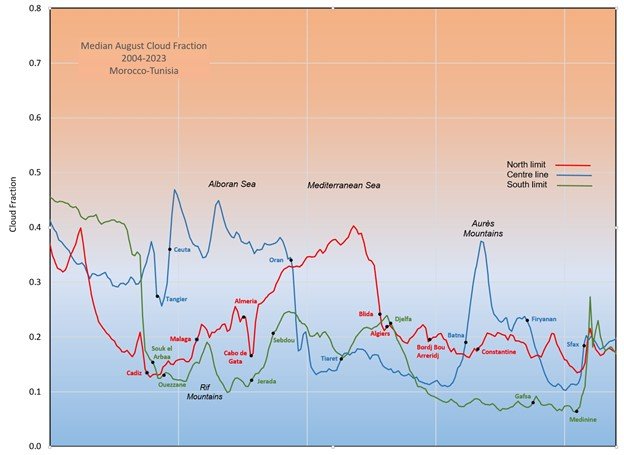 En la Figura 3, un mapa de la fracción de nubes, o porcentaje de nubes mensuales si se multiplica, derivado de dos décadas de observación satelital muestra que las aguas del Mar de Alborán y el Estrecho de Gibraltar están más nubladas que cualquier otra región a lo largo de la parte africana de la ruta. Alimentadas por las corrientes atlánticas entrantes, las frías aguas superficiales del Mar de Alborán crean una inversión de temperatura estable en la superficie durante el Levante. El aire debajo de la inversión a menudo, pero no siempre, se convierte en niebla, estratos y neblina a medida que se enfría desde abajo. Esta nube baja es más espesa por la mañana y por la noche, pero rara vez penetra más de unos pocos kilómetros tierra adentro y, por lo general, mucho menos. En los meses de verano, la brisa Levante es generalmente moderada y su impacto en el clima es moderado. Debido a que gran parte de la nubosidad del Estrecho se forma en un nivel bajo en la atmósfera, se erosiona rápidamente a medida que aumentan las temperaturas durante el día, aunque puede ser demasiado tarde para un eclipse que ocurre a media mañana. Se proporcionan más detalles sobre la climatología de las nubes en el gráfico de nubosidad a lo largo de la línea central y ambos límites (Figura 4). En este gráfico se puede determinar el valor de salirse de la línea central en busca de una mejor climatología. Los sitios terrestres son significativamente más prometedores que aquellos sobre o cerca del agua (compárese la línea central sobre el agua entre Ceuta y Orán con los caminos terrestres de los límites norte y sur). El terreno elevado también ofrece perspectivas climáticas menos favorables, la nubosidad aumenta alrededor del 8 por ciento a medida que el límite sur cruza las montañas Rif en Marruecos, y casi el 14 por ciento en el límite sur a través de la Cordillera Tel Atlas entre Sebdou y Djelfa en Argelia.